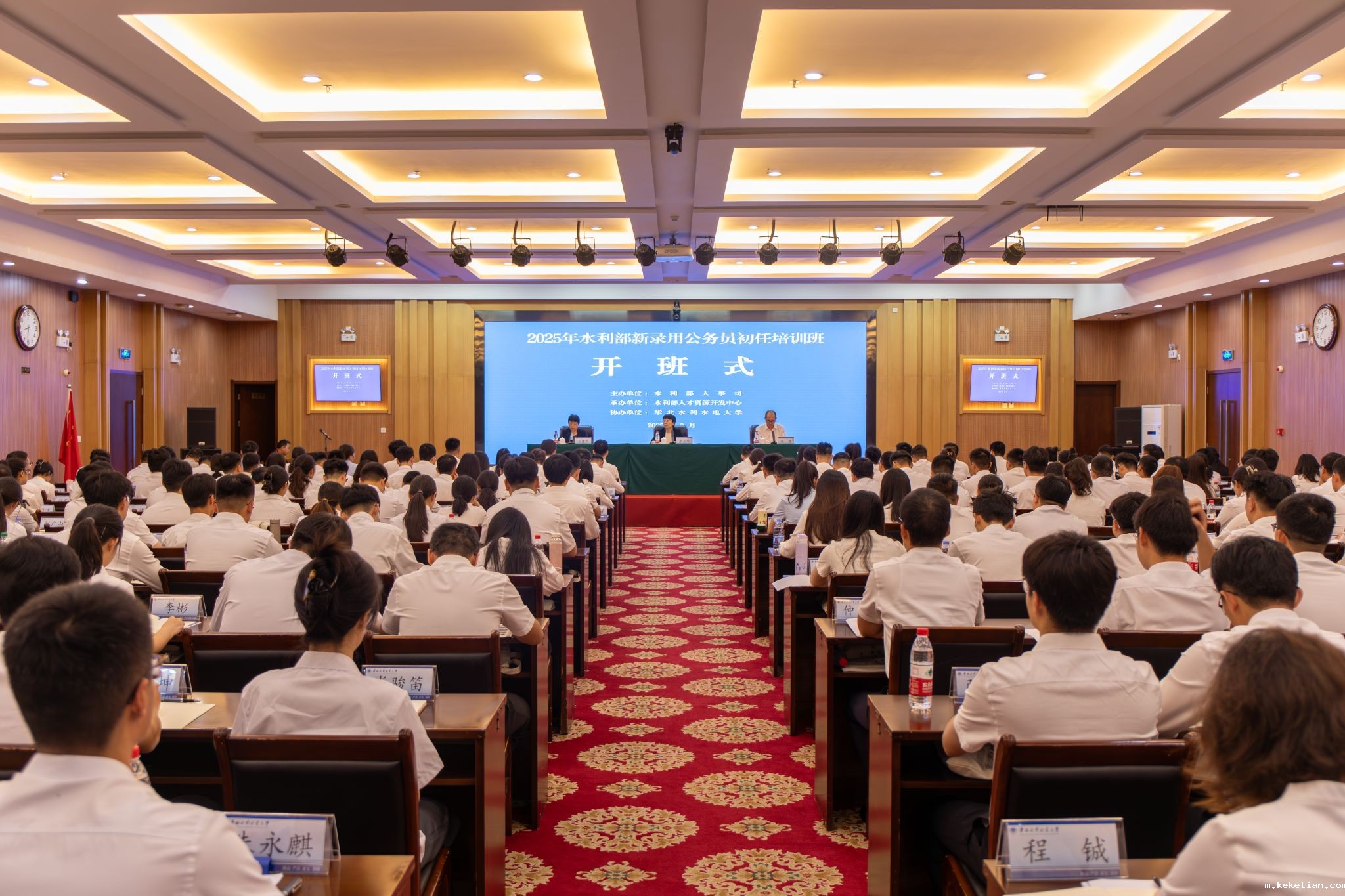 2025年9月16日,水利部新录用公务员初任培训班在我校开班。水利部人事司公务员处处长李笑吟、betvlctor登录网站副校长马建琴出席了开班仪式,开班仪式由水利部人才资源开发中心培训处处长侯健主持,来自水利部机关及各流域管理机构的216名新录用公务员参加了开班仪式。