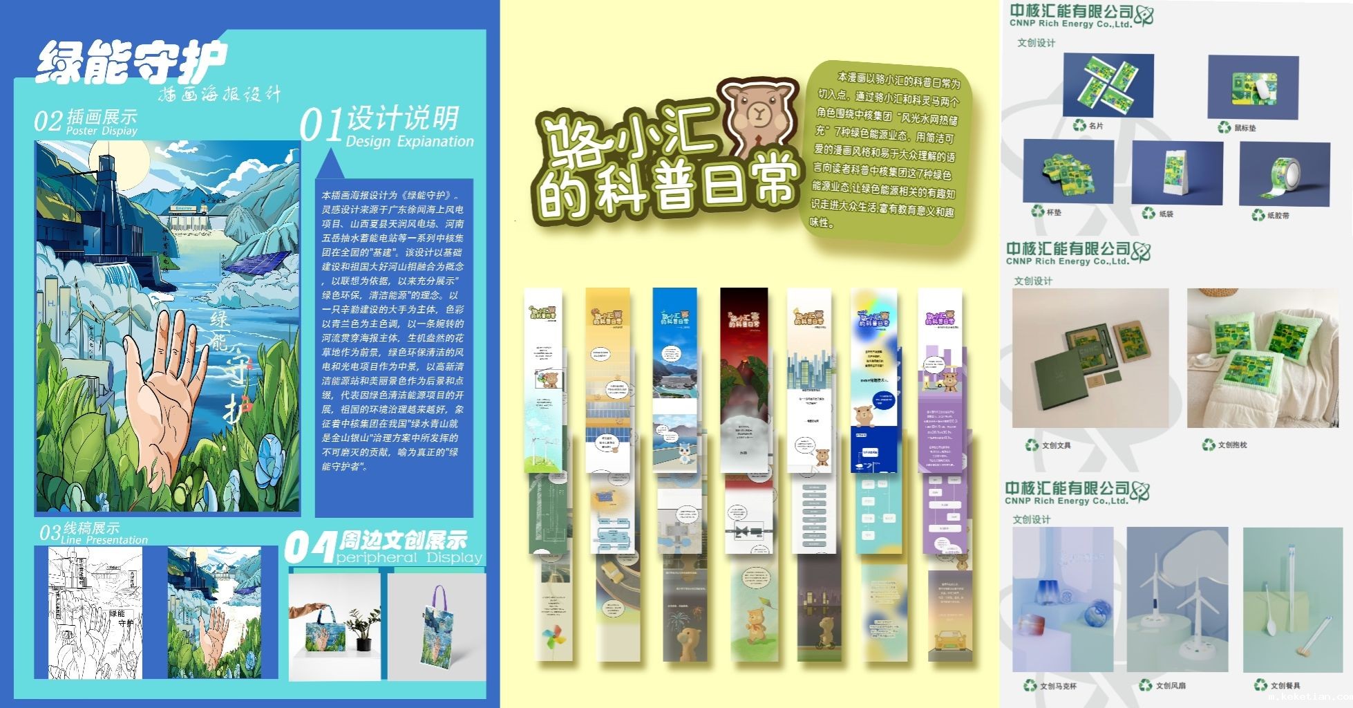“绿能守护者计划”科普设计大赛自开赛以来,吸引了众多高校的积极参与。围绕着非核绿色能源科普创意设计,共分6种作品类型,具体为:“绿能守护者计划”logo、七大业态绘本设计、“科灵马”“骆小汇”表情包设计、新华发电中核汇能文创产品设计、绿能产业创意海报设计与绿能产业原创漫画设计。评选方式分为初选阶段与复评阶段,采取了“专家评审+网络评选”方式。在艺工坊辅导员工作室师生团队的共同努力下,共有8件作品获奖。其中包括一等奖3个、二等奖3个、三等奖2个,展现了同学们在环保科普设计领域的卓越才华与创新能力。