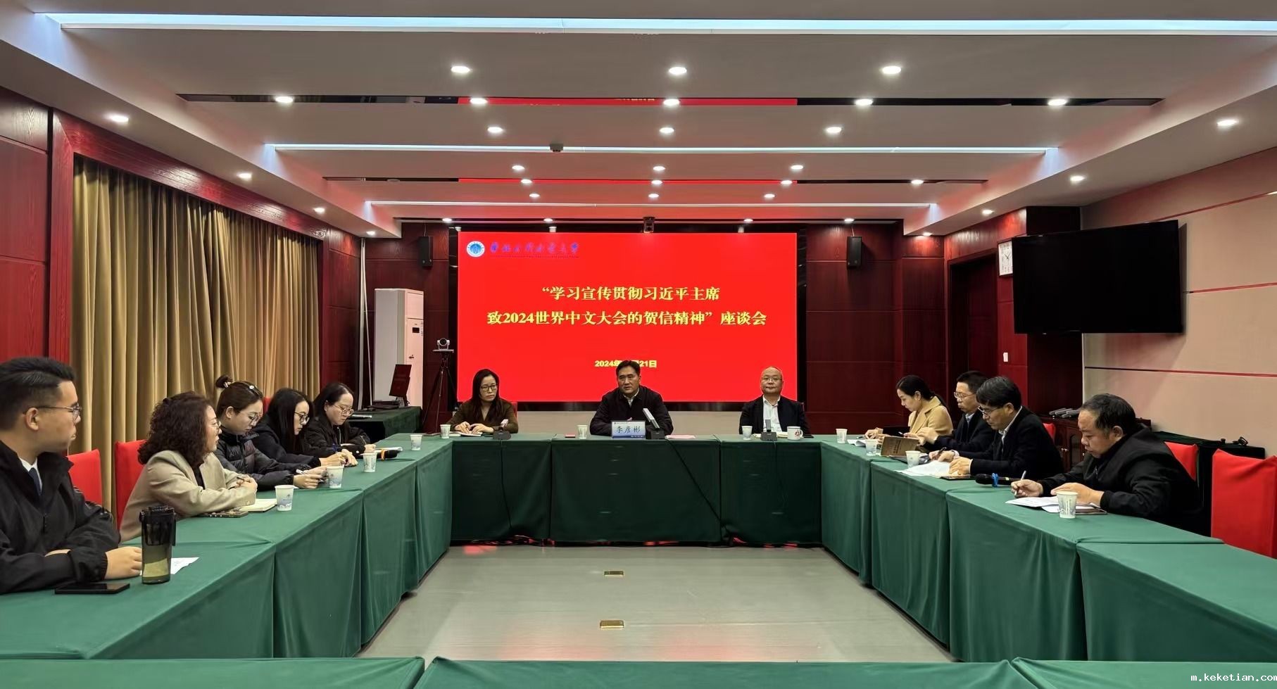 11月15日至17日,2024世界中文大会在北京举行。国家主席习近平向大会致贺信,热烈祝贺孔子学院成立20周年。国家副主席韩正出席开幕式,宣读习近平主席贺信并致辞。为学习宣传贯彻习近平主席致2024世界中文大会的贺信精神,11月21日,我校在龙子湖校区行政楼第四会议室召开“学习宣传贯彻习近平主席致2024世界中文大会的贺信精神”座谈会。副校长李彦彬出席会议,座谈会由国际交流与合作处处长魏新强主持。
