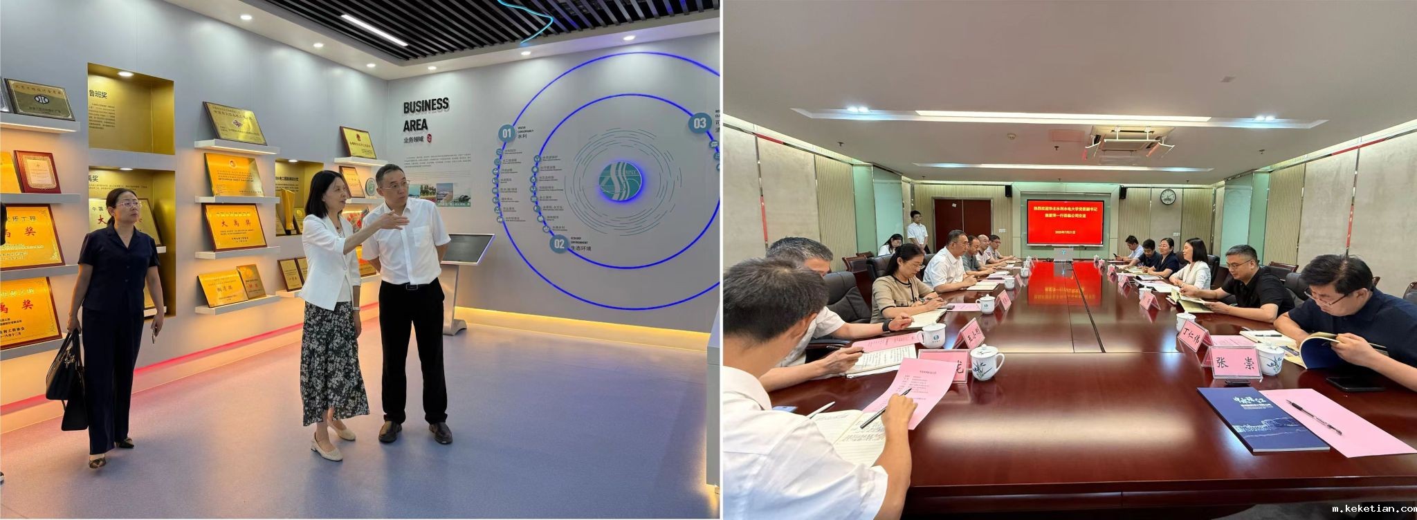 在中铁水利水电规划设计集团有限公司,总经理邹军贤热情接待焦爱萍一行,详细介绍了集团公司在重大水利工程规划设计、前沿技术研发等方面的实践成果,希望以此为契机进一步深化校企合作。焦爱萍表示,期待双方在协同开展科研攻关、卓越创新人才联合培养、技术培训体系共建等方面建立长效合作机制,共同培育适应新时代需求的复合型人才,为水利水电事业高质量发展注入新动能。双方围绕以上议题展开讨论,就建立产学研长效合作机制达成多项共识。