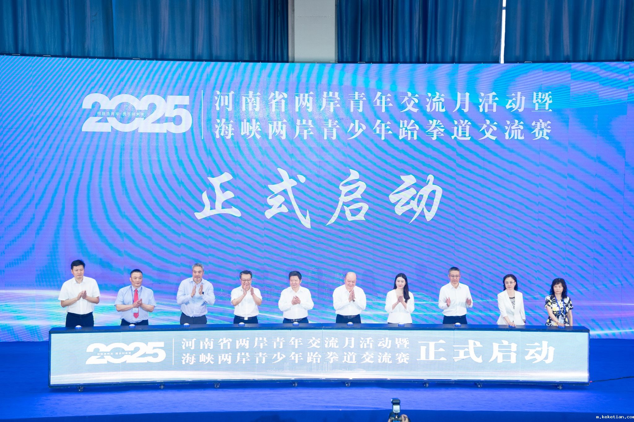 海峡两岸关系协会常务副会长龙明彪出席,河南省台办主任景劲松致欢迎辞,新党副主席李胜峯,台湾高雄市跆拳道协会理事长郑志忠分别致辞,校党委书记王笃波与主承办单位领导和嘉宾共同进行启动。