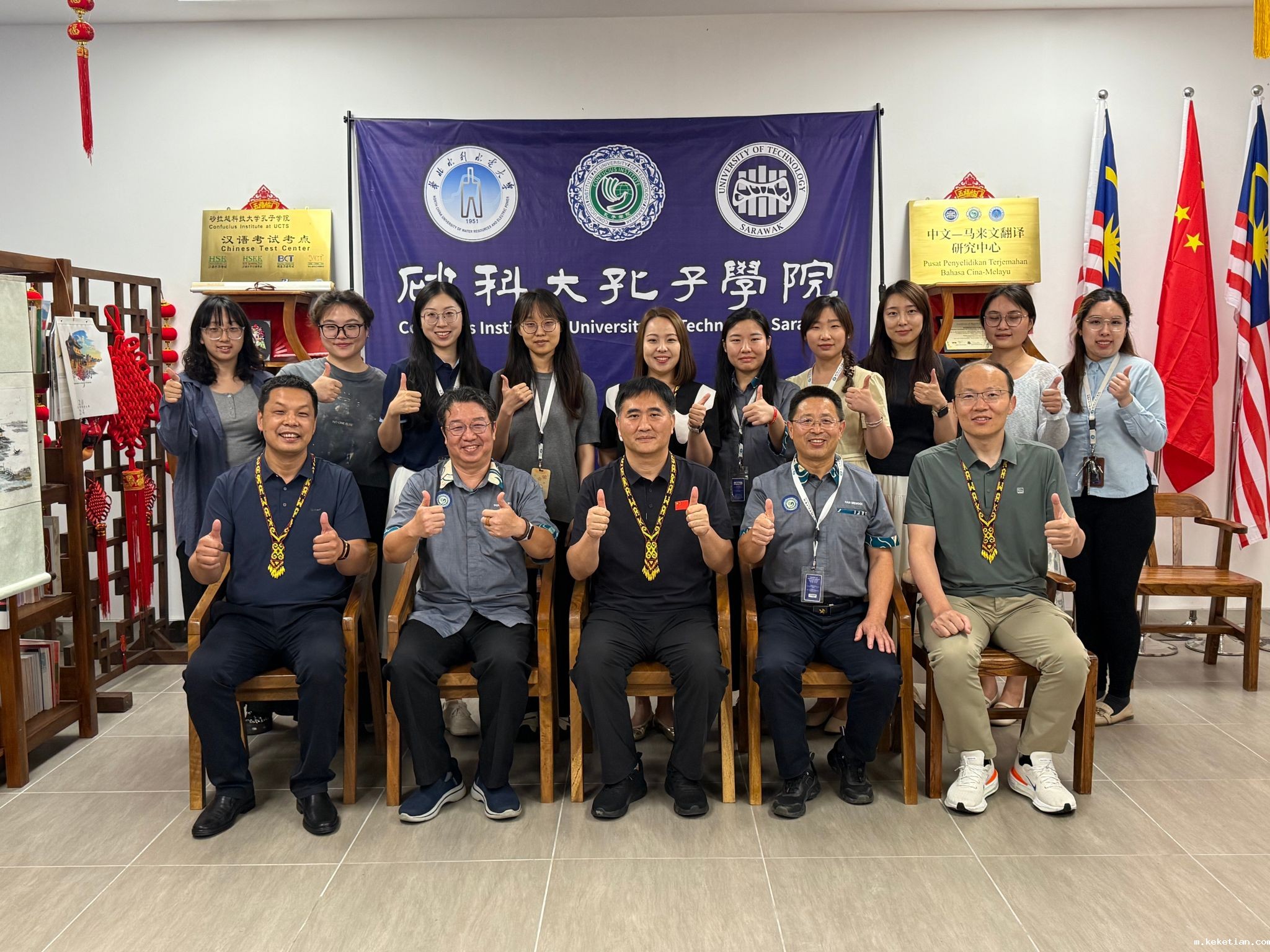 在砂科大孔子学院,李彦彬听取了中方院长韩孟奇关于2024至2025年度孔院工作的汇报,并与国际中文教育志愿者亲切交谈,对“中文+水利”特色发展提出指导性意见。随后,李彦彬一行实地考察了砂科大孔子学院教学点——马来西亚无国籍儿童教育机构,参观了华教文物馆。