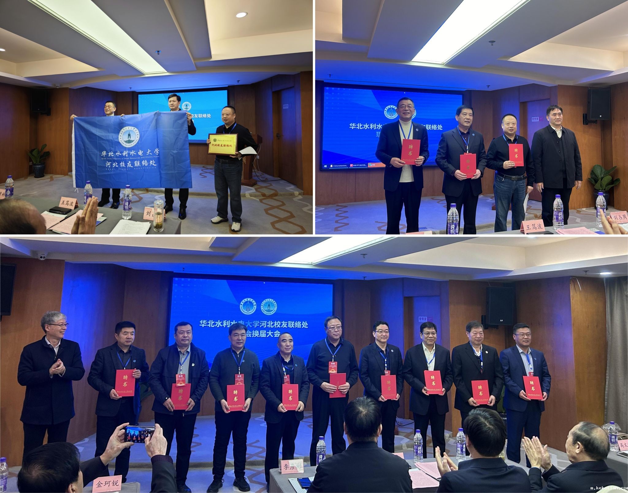 校党委书记王笃波、副校长李彦彬、校友总会副会长高文荣分别向河北校友联络处授旗授牌,颁发聘书。