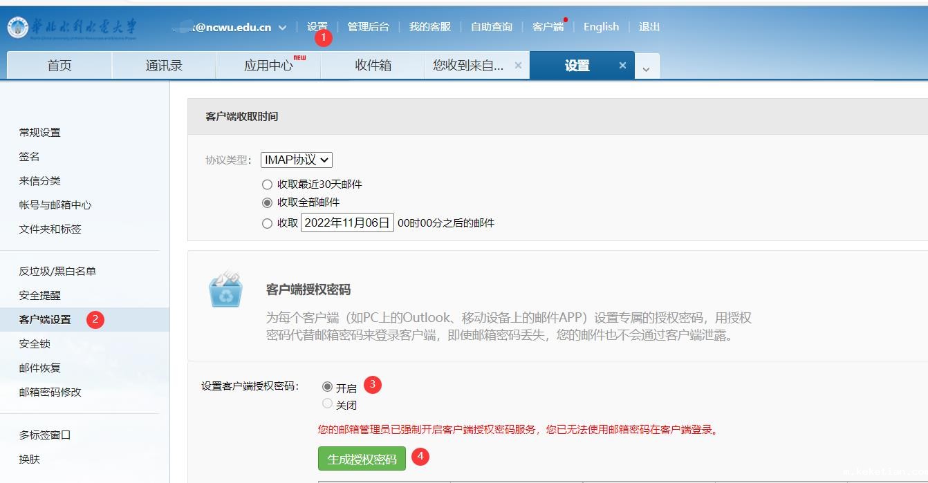 (使用客户端收发邮件还需要通过WEB端进入邮箱按上图设置开启客户端授权密码,并使用生成的授权密码作为客户端登录密码)